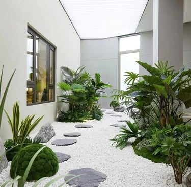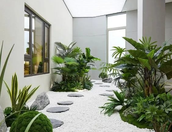Seperti terlihat pada foto inspirasi, taman kering mampu menciptakan jalur pijakan batu yang rapi dengan dominasi warna putih dan hijau, memberikan kesan luas dan tenang.